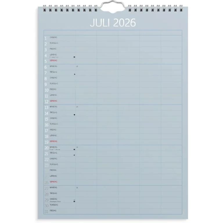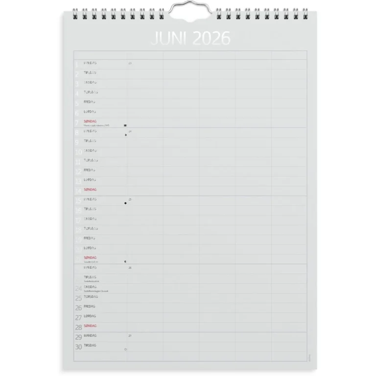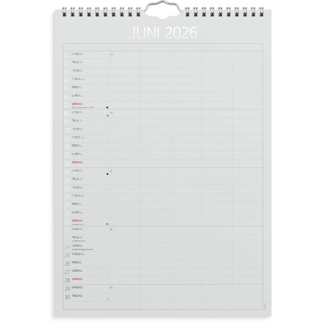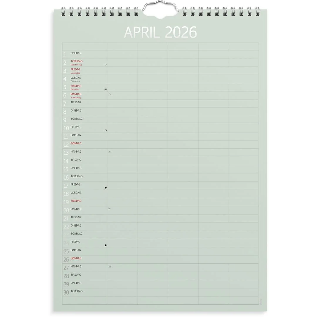Kalenderen er delt inn med en måned per side. Hver måned er delt inn i 5 kolonner, slik at hvert familiemedlem har sin egen kolonne hver dag. På den måten kan du raskt og enkelt få en oversikt over hele familiens aktiviteter og avtaler. Med månefaser, helligdager og kongelige fødselsdager. Opphengsbøyle gjør det enkelt å henge den på veggen. Kalenderen er miljømerket FSC®, som betyr at hele produktet er produsert med papir og annet trevirke fra et ansvarlig og bærekraftig skogsbruk.
