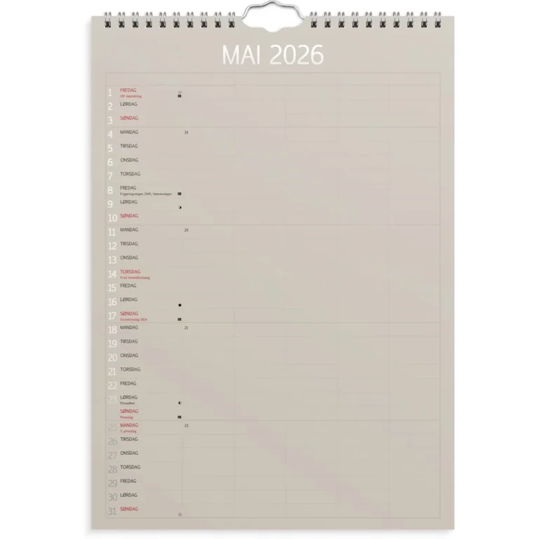 Familiekalender i praktisk og elegant design med skiftende farger. Kalenderen er delt inn med en måned per side. Hver måned er delt inn i 5 kolonner, slik at hvert familiemedlem har sin egen kolonne hver dag. På den måten kan du raskt og enkelt få en oversikt over hele familiens aktiviteter og avtaler. Med månefaser, helligdager og kongelige fødselsdager. Opphengsbøyle gjør det enkelt å henge den på veggen. Kalenderen er miljømerket FSC®, som betyr at hele produktet er produsert med papir og annet trevirke fra et ansvarlig og bærekraftig skogsbruk. – Følger kalenderåret – 5 kolonner, ett til hvert familiemedlem – Opphengsbøyle – Helligdager – Månefaser – Kongelige fødselsdager – Liggende månedsoppslag – 12 sider – 200g papir – Format: 210x297mm