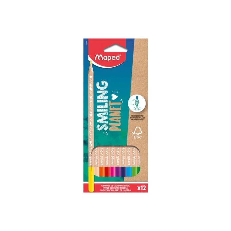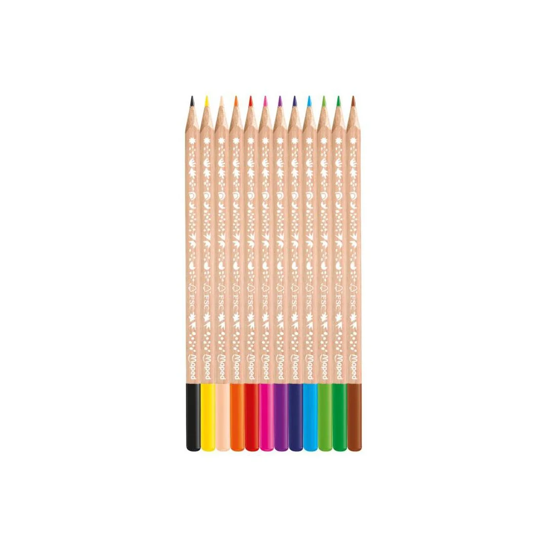 Fargeblyantene fra Color’Peps Maped-serien er utformet med en spesifikk trekantet form for enkel håndtering. Med sin ergonomiske form er dekorerte fargeblyanter av naturlig tre tilpasset barnets hånd og gir en kompakt og praktisk pappeske med 12 blyanter.