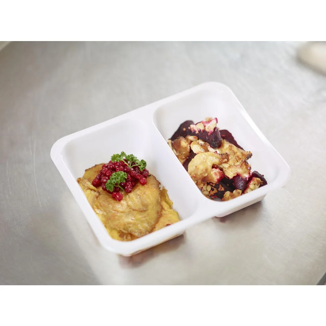 Forseglbare Duniform menyformer med to rom. Formene kan forsegles med film i Duniform forseglingsmaskin. Hvis du ønsker å forlenge holdbarheten, er formene også velegnet til emballering i modifisert atmosfære (MAP). Formene er produsert i hvit polypropylen, tåler temperaturer fra -20°C til +120°C. – Materiale: PP – Mål: 227x178x40mm – Volum: 550 / 480ml – Farge: Hvit – Varmebestandighet: Kald bruk, varmt innhold, mikrobølgeovn – Kuldebestandighet: Kjøleskap, fryser