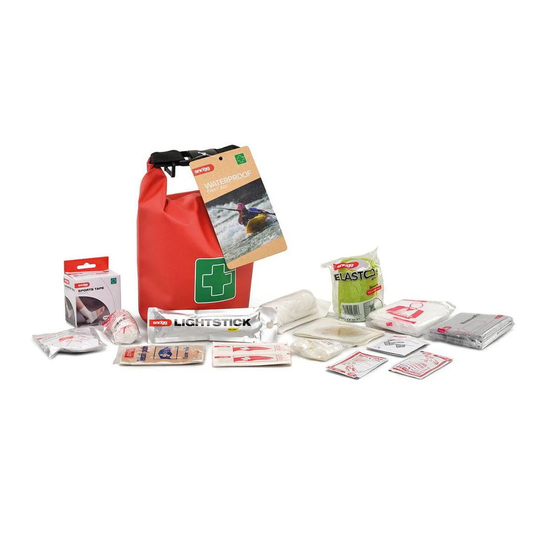 Den solide, vanntette posen vil til enhver tid holde førstehjelpsutstyret tørt og lett tilgjengelig. Posen er sydd i et vanntett materiale med tapede sømmer og rulletopp med spenne, som gjør at den tåler fukt og vann I posen har et eget innholdsnett med plaster, bandasjer, støttebandasje, sportstape, redningsfolie mm.