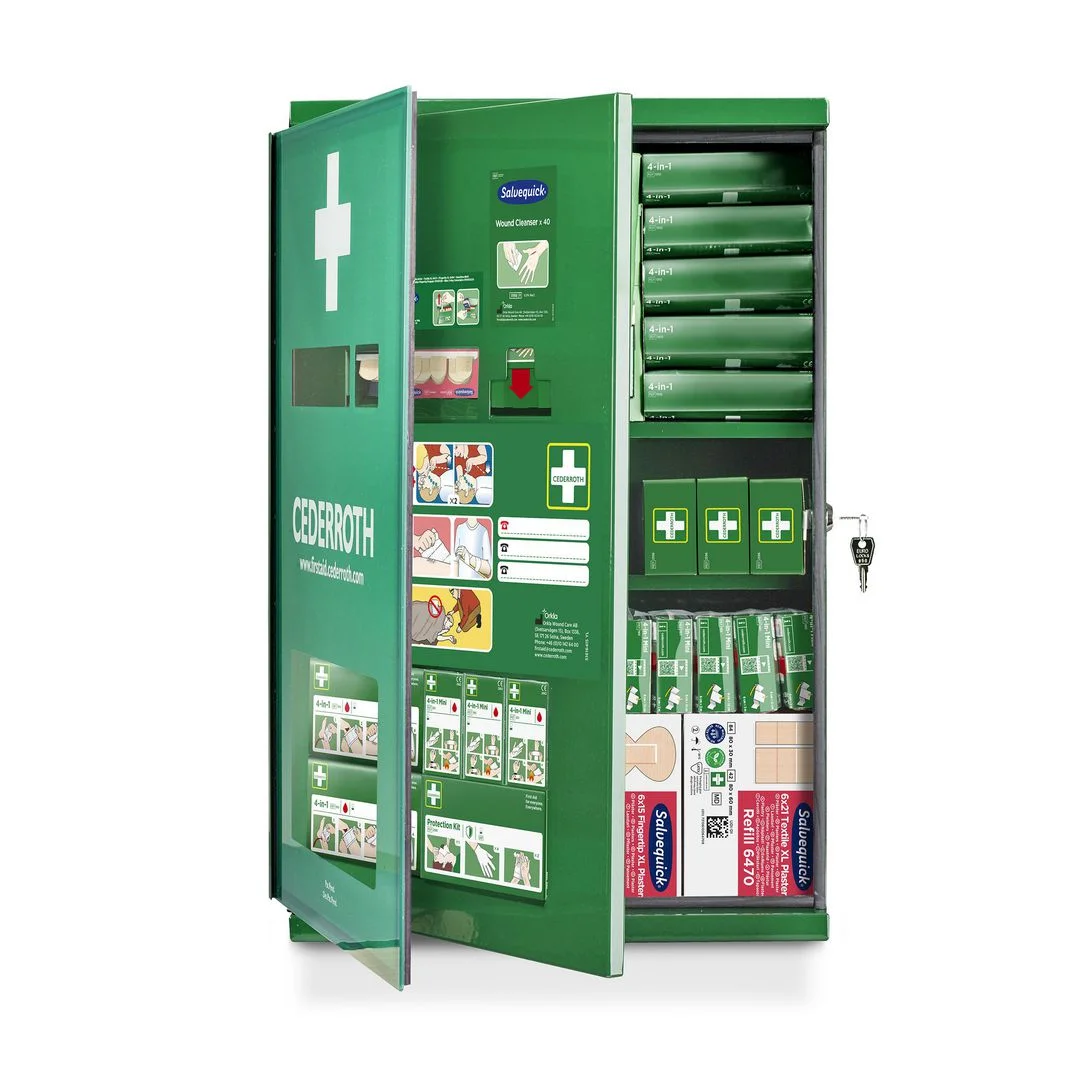- Inneholder: 1 stk Salvequick Plasterautomat, 1 stk Savett Sårvaskautomat, 7 stk Cederroth 4-in-1 Blodstopper, 9 stk Cederroth 4-in-1 Mini Blodstopper, 4 stk Cederroth Beskyttelsespakke, 1 eske (6×40 st) Salvequick Tekstilplaster, 1 eske (6×45 st) Salvequick Plastplaster, 1 eske (6×15 st) Salvequick Fingertupplaster, XL, 1 eske (6×21 st) Salvequick Tekstilplaster, XL, 4 esker (x40 st) Savett Sårvask, Saks og pinset