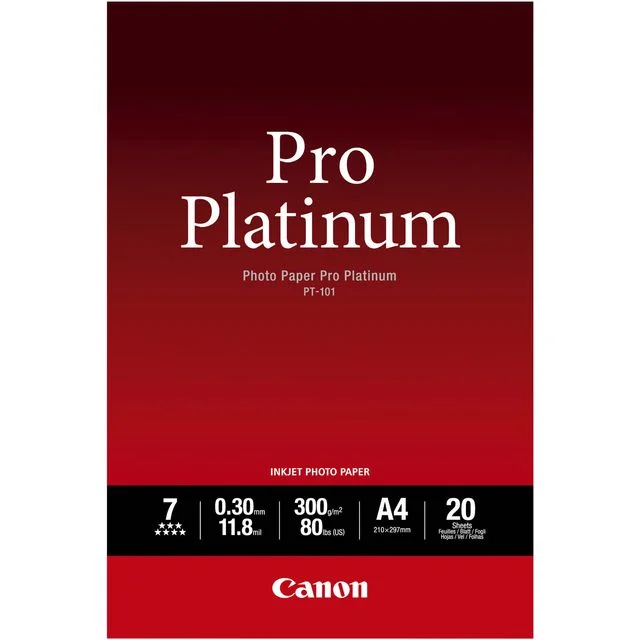 Størrelsen er skalert til portretter eller collager, og resultatet er høykvalitetsutskrifter som fortjener en plass på veggen. Canon Pro Platinum-fotopapiret leveres i pakker på 20 ark og er kompatibelt med en rekke Canon-fargeskrivere. Resultatet er flotte utskrifter av hvert bilde. Skriv ut bilder av høy kvalitet Skinnende overflate som gir et profesjonelt resultat.