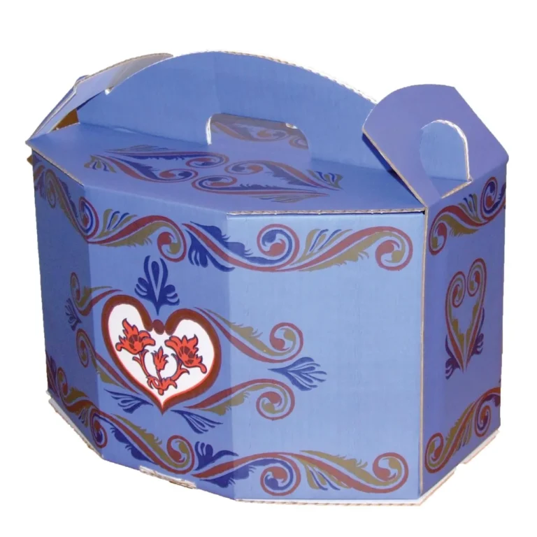 Gavetine i tradisjonsrik norsk design. Fasthengende lokk som låses med sideklaffer. – Produsert i bølgepapp – Mål: 340x250x210mm – Volum: 18l – Farge: Blå