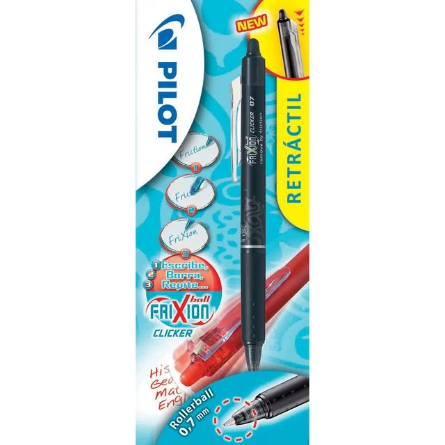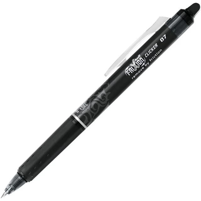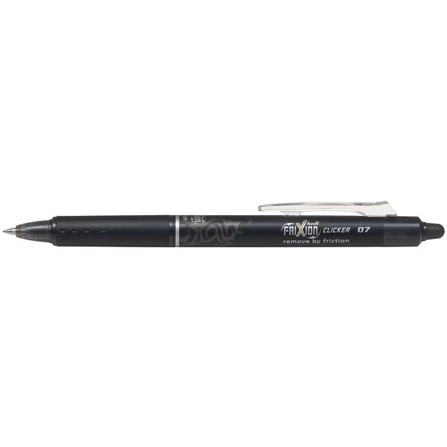 Du kan enkelt fjerne og korrigere feil med den inntrekkbare gelpennen Pilot FriXion Clicker, som har den unike FriXion-visketuppen og varmesensitivt blekk. Denne gelpennen bruker varmesensitivt blekk, som kan viskes ut umiddelbart med FriXion-visketuppen som sitter på enden.