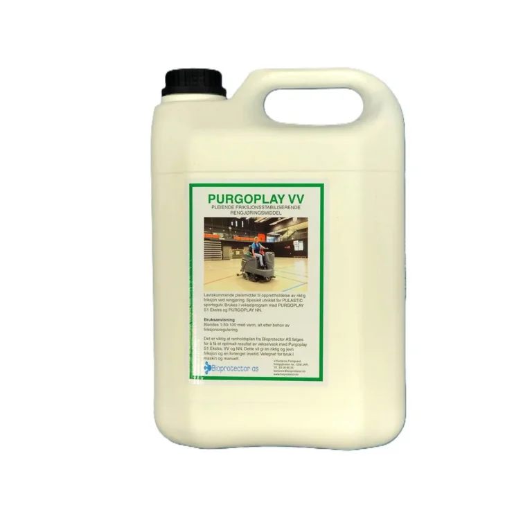 Purgoplay VV er et pleiemiddel som i kombivask med NN gir en jevn og riktig friksjonsregulering og forlenget levetid til gulvet.