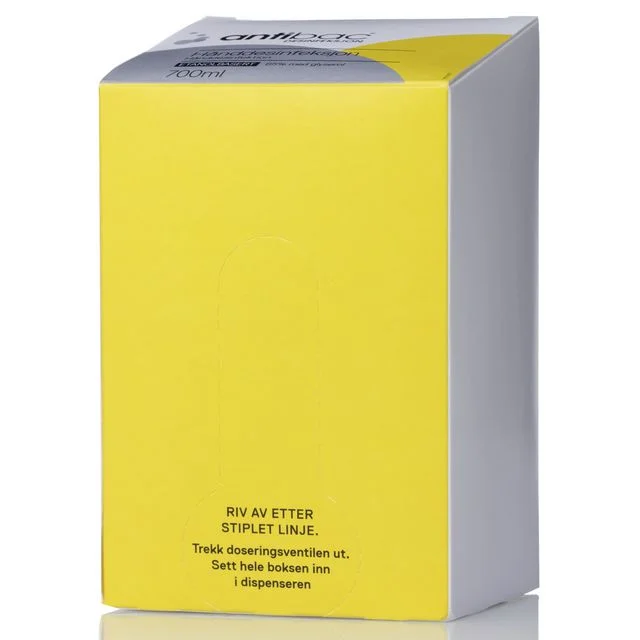Flytende hånddesinfeksjon med rask effekt på bakterier, ulike virus og sopp. Hånddesinfeksjon 85 % hovedsakelig basert på etanol Tilfredstiller EN 1500 kravene Den kleber ikke, absorberes raskt og er enkel å påføre Leveres i bag-in-box 700 ml til Antibacs berøringsfrie dispenser Desinfeksjonsmidler skal anvendes på forsvarlig vis.