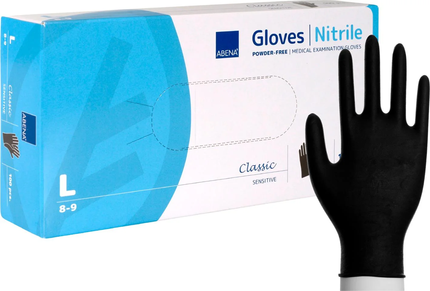 Abena Classic Sensitive undersøkelseshanske er uten pudder, og former seg etter hånden under bruk og har mikroteksturerte fingerspisser.