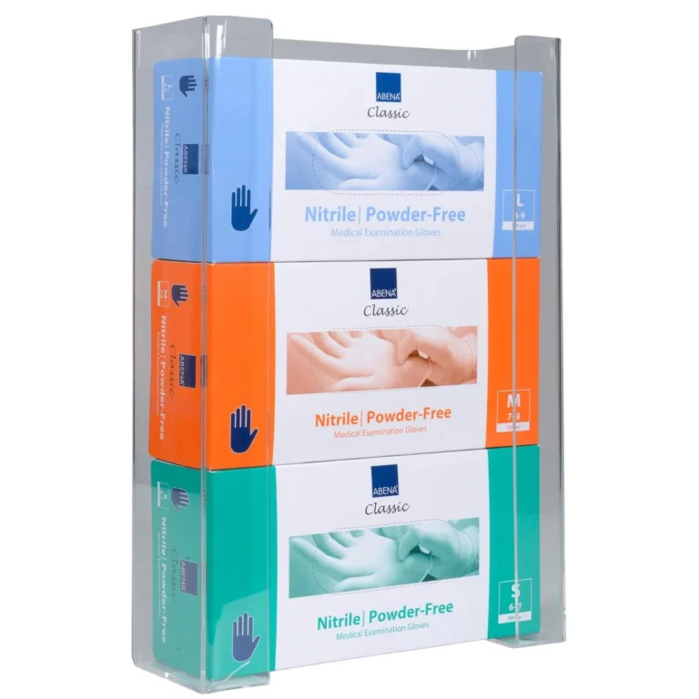 Transparent stativ til engangshansker, som passer til hanskebokser, ansiktsservietter, forklær i dispensere m.m.