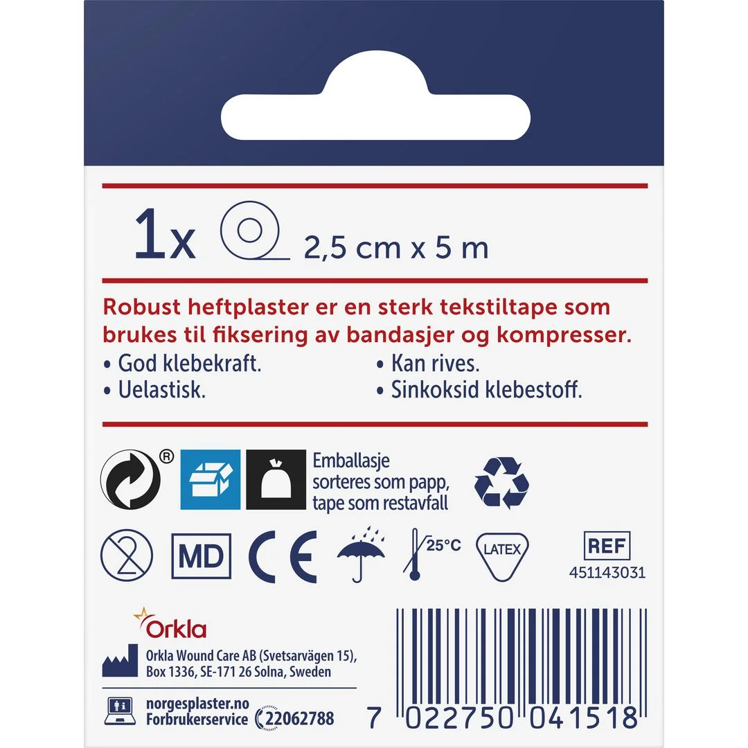 Robust heftplaster tekstiltape er en fikseringstape til normal hud med god klebekraft som brukes til fiksering av kompress og bandasje. Den hudfargede teipen er 2,5cm bred og 5m lang.