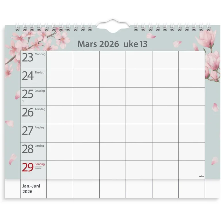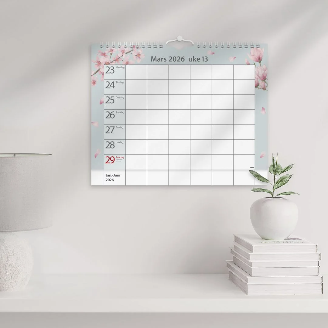 Kalenderen har plass til avtalene til hele 6 familiemedlemmer samtidig – hver uke, hele året. Med månefaser, helligdager, kongelige fødselsdager og årsoversikt på bakplaten. Opphengsbøyle gjør det enkelt å henge den på veggen.
