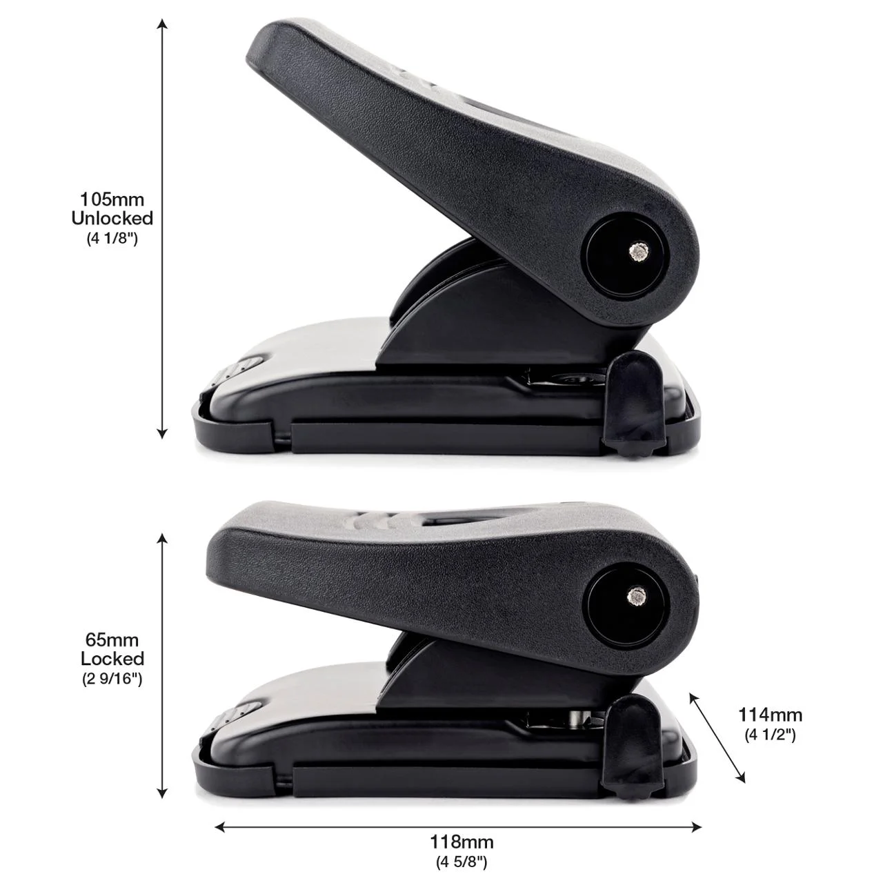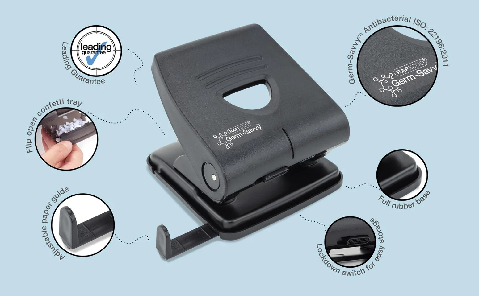 Praktisk avfallsskuff som samler opp papirbiter Papirguide med flere format som enkelt stilles inn på ønsket hulling.