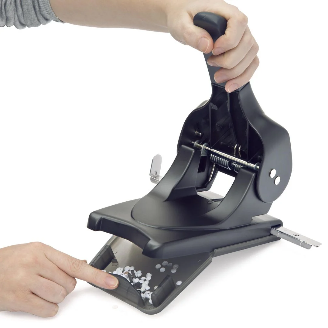 Nøyaktige hull der du trenger dem, takket være den justerbare papirguide i metall. Praktisk avfallsskuff som samler opp papirbiter.