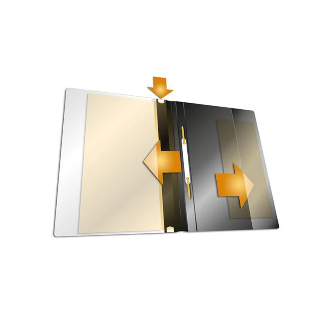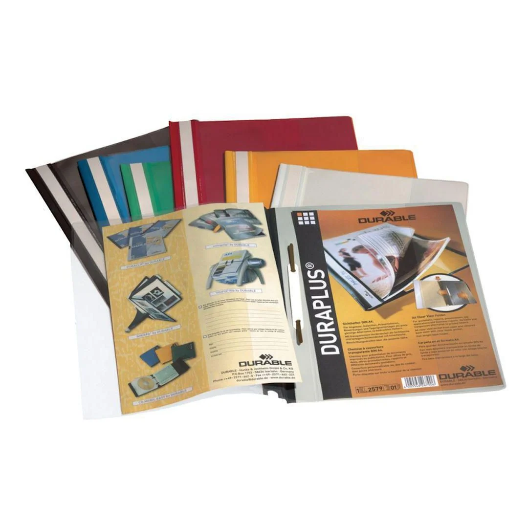 Profesjonell presentasjon og oppbevaring av dokumenter. DURABLE hurtighefter er en effektiv løsning for å presentere og organisere dokumenter i A4+-format. Med en transparent forside og farget bakside, gir den et stilrent utseende samtidig som innholdet beskyttes. Den ekstra brede designen tillater enkel innsetting av plastlommer.