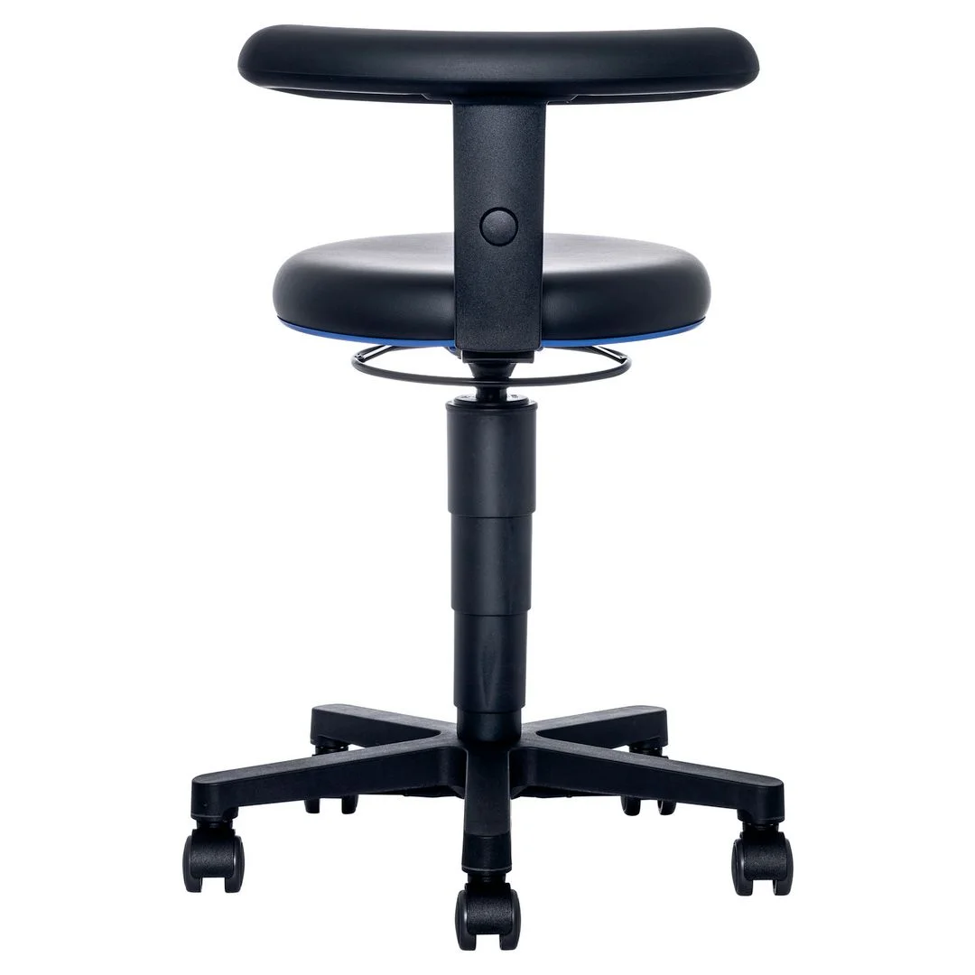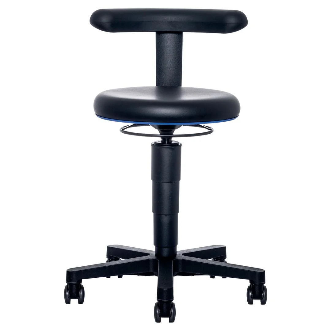 Ergonomisk industristol med fleksibel støtte. BIMOS Flex 9463 tilbyr optimal komfort og fleksibilitet med sin fleksible støtte som kan brukes som både armlene og ryggstøtte. Stolen er designet for bruk i hygiene-sensitive miljøer og har et polstret sete i kunstskinn, ideelt for langvarig bruk. Justerbar høyde og høy mobilitet gjør den perfekt for varierte arbeidsforhold. – Setehøyde: 45-65cm – Setebredde: Ø40cm – Lav rygg – Maks vektkapasitet: 120kg – Maks anbefalt brukstid: 3 timer – Materiale: Kunstlær – Farge: Sort og blå – Sertifiseringer: DIN EN ISO 9001, ISO 14001, OHSAS 45001