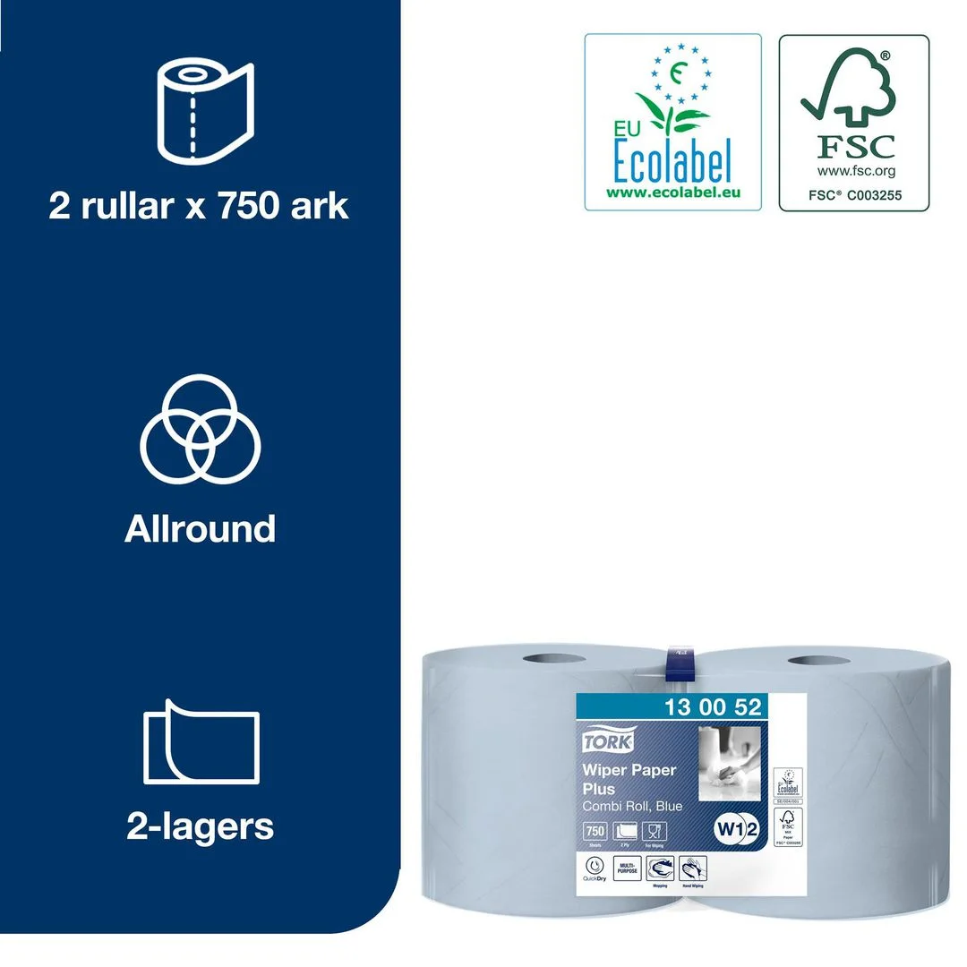 Tørkepapir Plus Maxi Senterrull blå W1/W2. Et allsidig papir som er ideelt for å tørke opp væske og tørke hender.