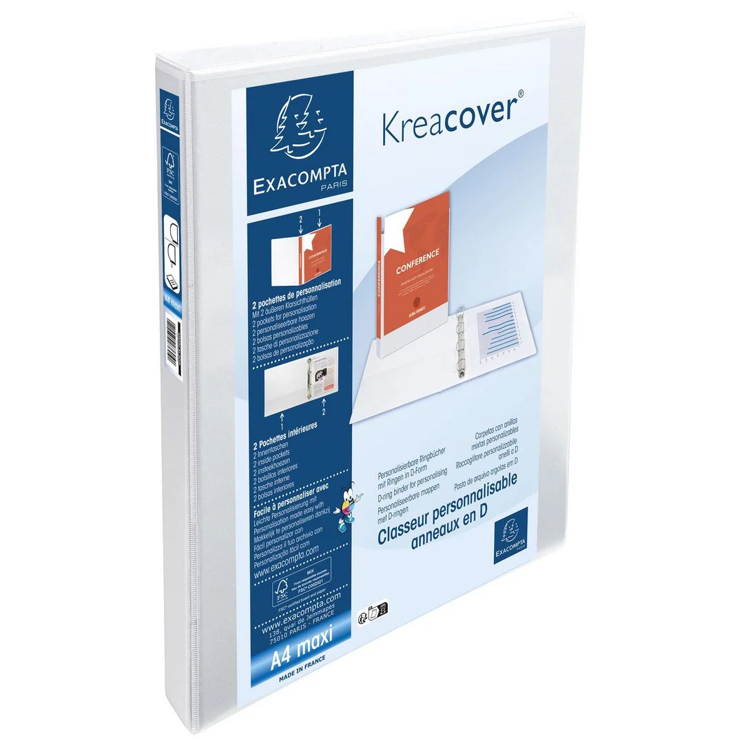 Exacompta Kreacover®-innstikkperm har gjennomsiktige lommer på forsiden, baksiden og ryggen, slik at du kan tilpasse permen og raskt identifisere innholdet. Kreacover er en rask løsning av høy kvalitet for skalerbare presentasjoner. Permen har et kraftig innbundet omslag med tilpasningslomme på forsiden og ryggraden av permen.