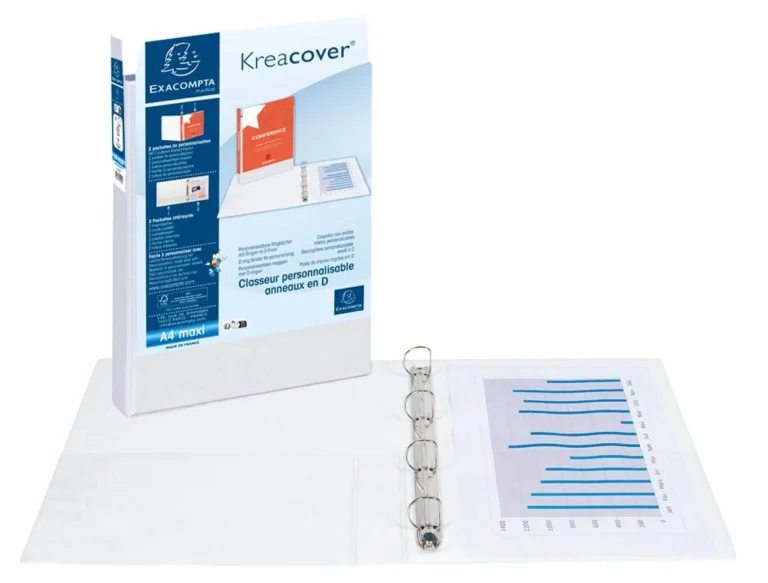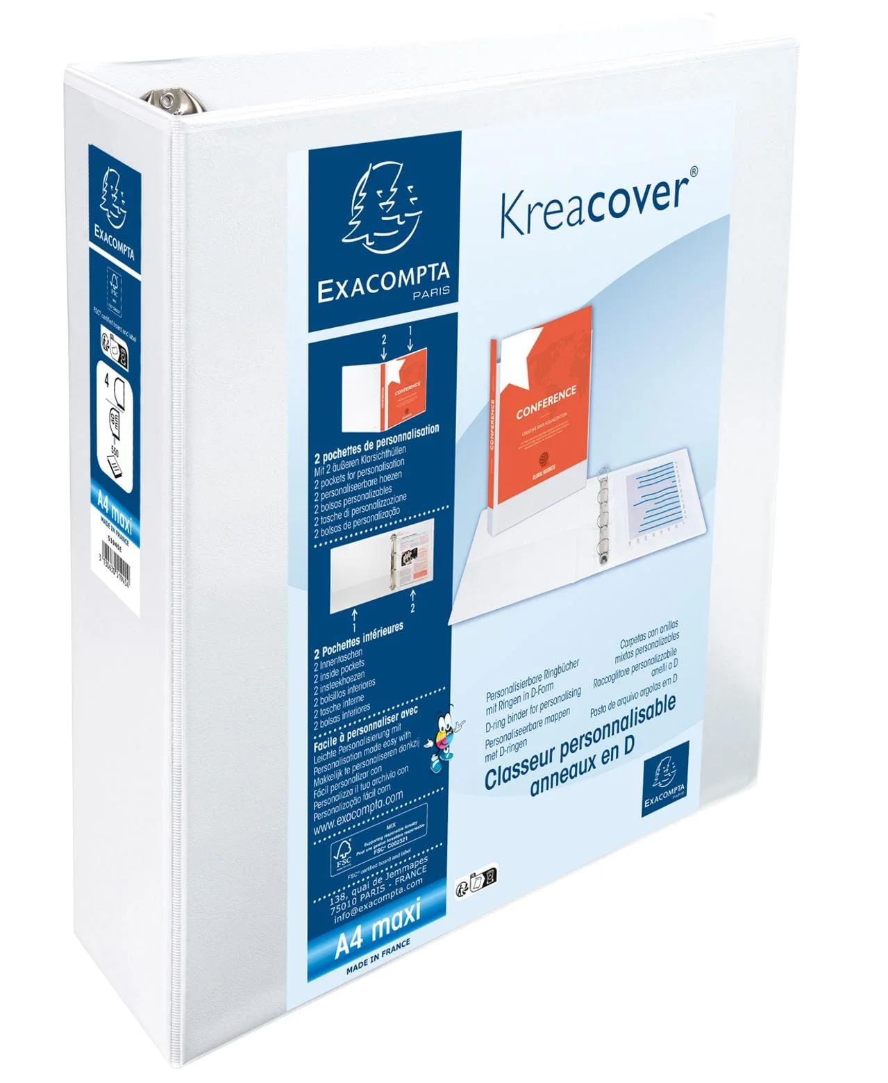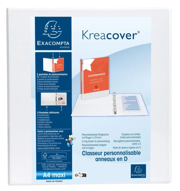 Kreacover er en rask og profesjonell løsning for en tilpassbar og lett skalerbar permLaget i solid PP med front- og rygglomme for enkel personalisering, samt to innvendige lommer for løse ark. – Ytre mål: 320x300mm – Mål A4 Maxi: 297x242mm – Mål innstikk: 310x286mm – Omslag og etiketter kan enkelt tilpasses via Kreaman-applikasjonen på Exacompta sin nettside
