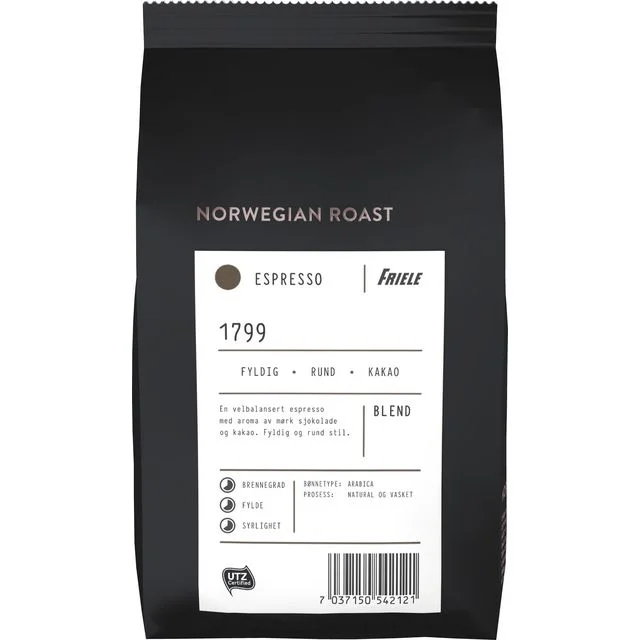 Start dagen med en forfriskende og aromatisk kopp med Norwegian Roast Espresso 1799 fra Friele, en velbalansert blend av arabicabønner.