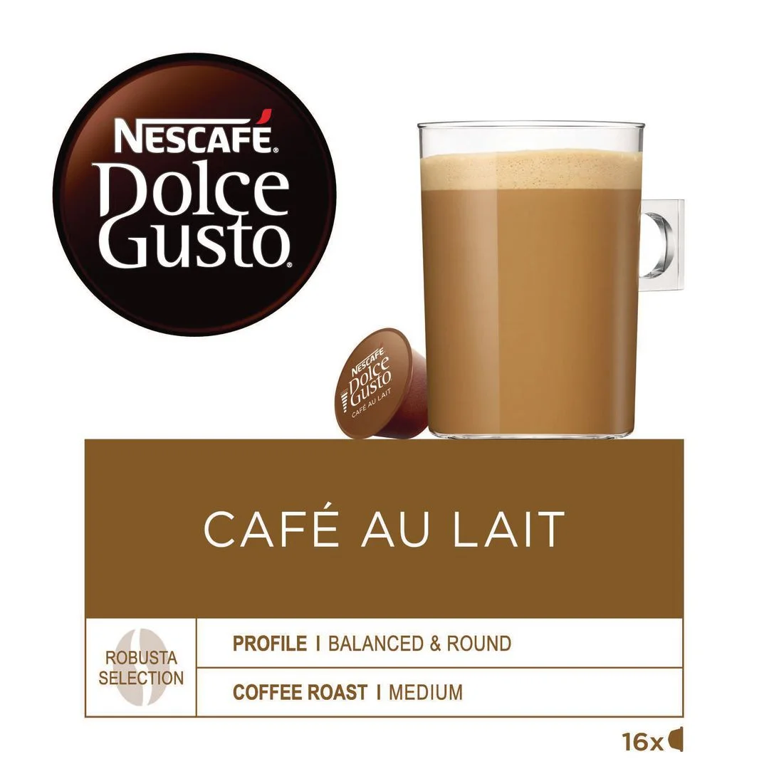NESCAFÉ® Dolce Gusto® Café au Lait – en balansert kombinasjon av intens kaffe og mild melk i én kapsel, som helst bør serveres i et krus (180 ml).