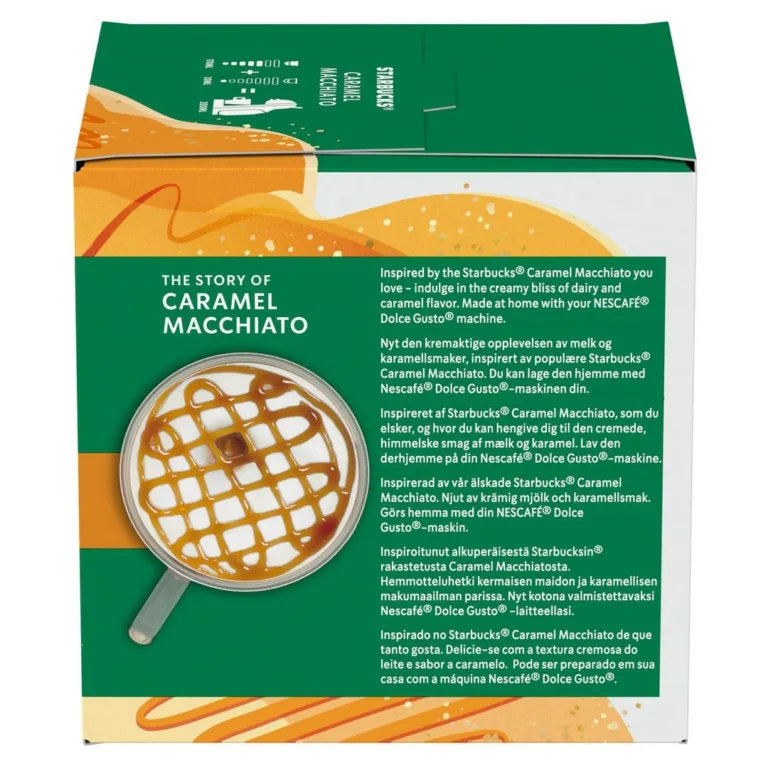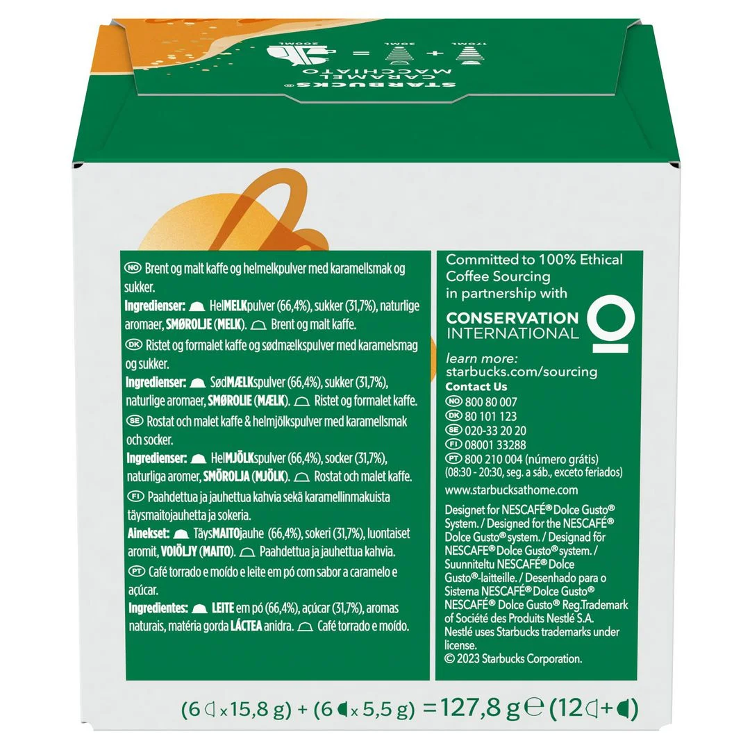 Enjoy STARBUCKS at home. Kaffen du elsker, kan du nå nyte hjemme. Belønn deg selv med denne cremede og himmelske smak av melk, kaffe og karamell Vi har forpliktet oss til 100% etisk dyrket kaffe med Conservation International som partnere 12 kaffekapsler i hver pakke.