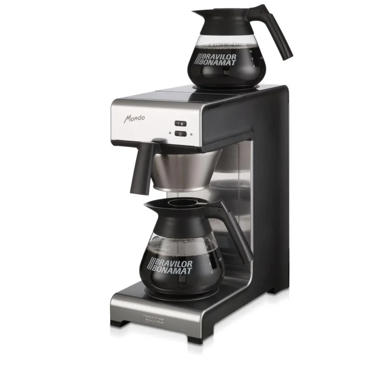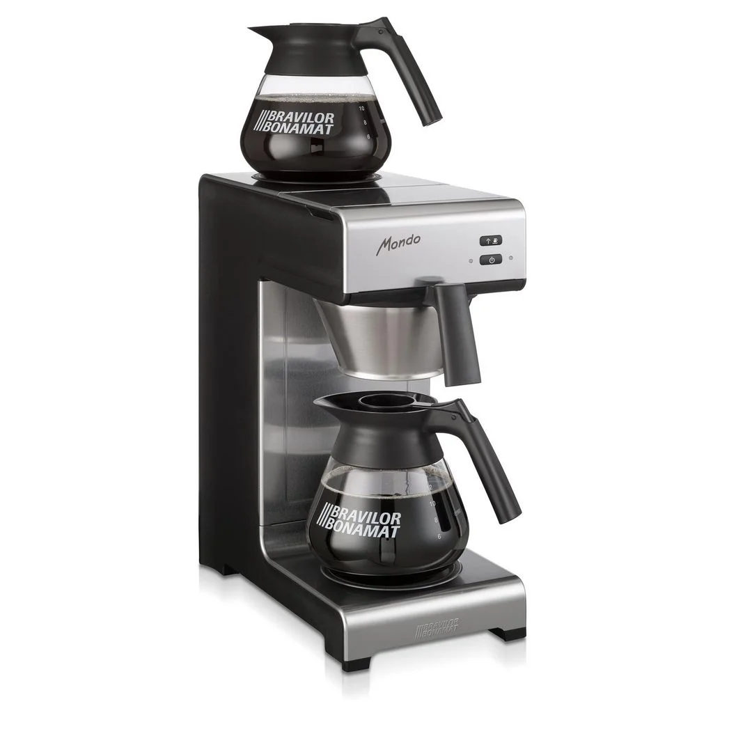 LED-display, filterholder i rustfritt stål og integrerte varmeplater gjør at maskinen er enkel i bruk. Manuell vannpåfylling gjør at maskinen kan plasseres hvor som helst De to selvregulerende varmeplatene opprettholder riktig temperatur på kaffen, og selv om kannen ikke er full sikres optimal kaffekvalitet Et signal indikerer om maskinen er fylt med vann Maskinen varsler når kaffen er klar og når det er behov for rensing 2 glasskanner medfølger Traktetid: 5 minutter.