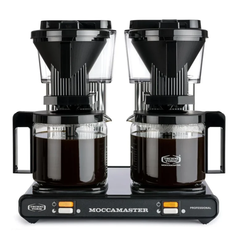 - Moccamaster Dobbel kaffemaskin har to glasskolber og trakter 2×1,25 liter kaffe på 6 minutter. Dette tilsvarer 2×10 kopper, og sikrer tilgang på nybrygget kaffe gjennom dagen. Trakteren sikrer at hver kopp kaffe har den samme høye kvaliteten når det gjelder smak og styrke.