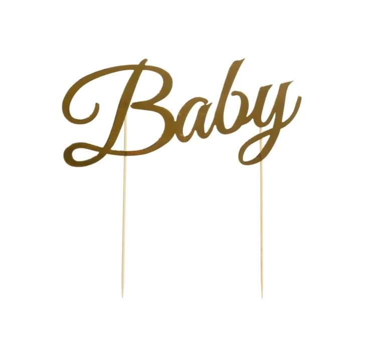 Elegant kaketopp i glitrende gull med teksten ‘baby’ – en stilig detalj til babyshower eller dåp. Skaper en festlig følelse på kaken med minimal innsats.