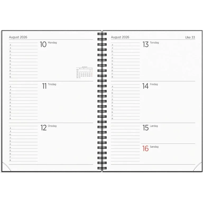 GRIEG Leo A5 er spiralisert med kartong omslag og gir deg hele uken på to flater for maksimal oversikt.