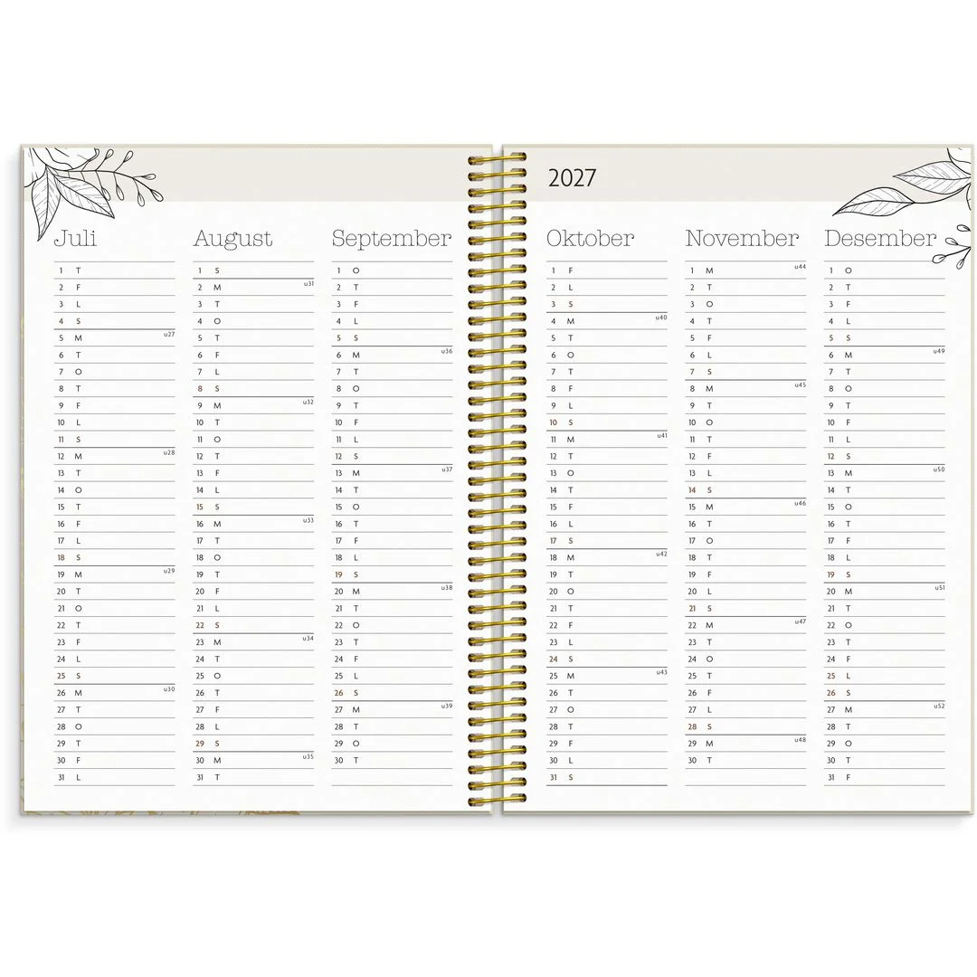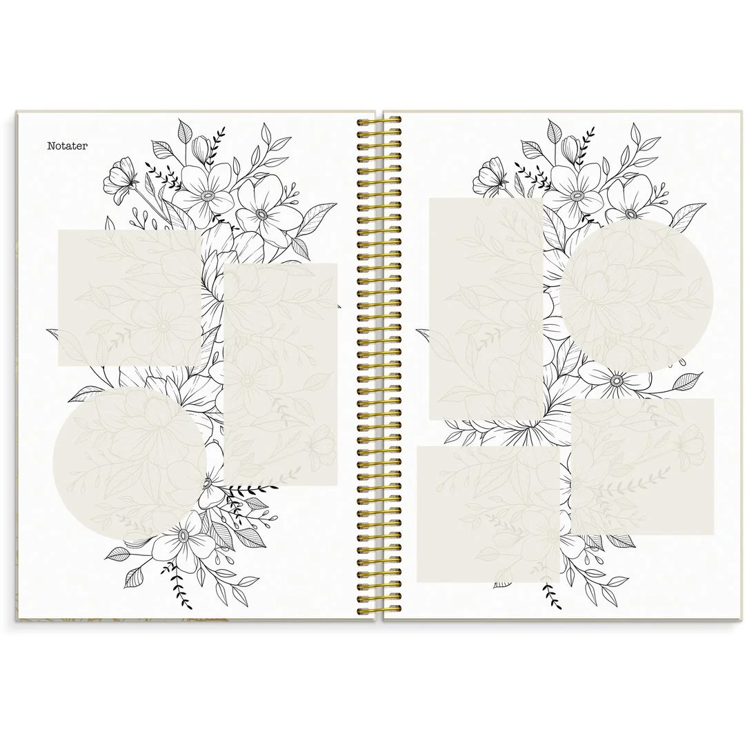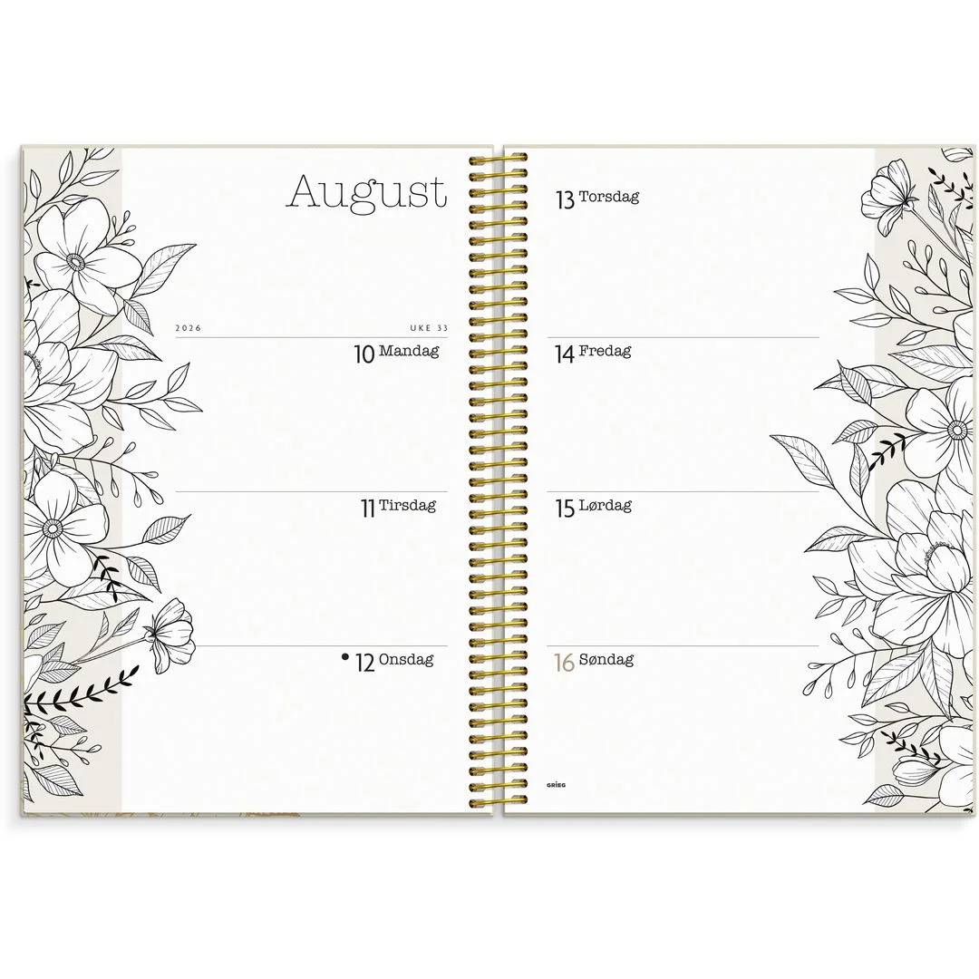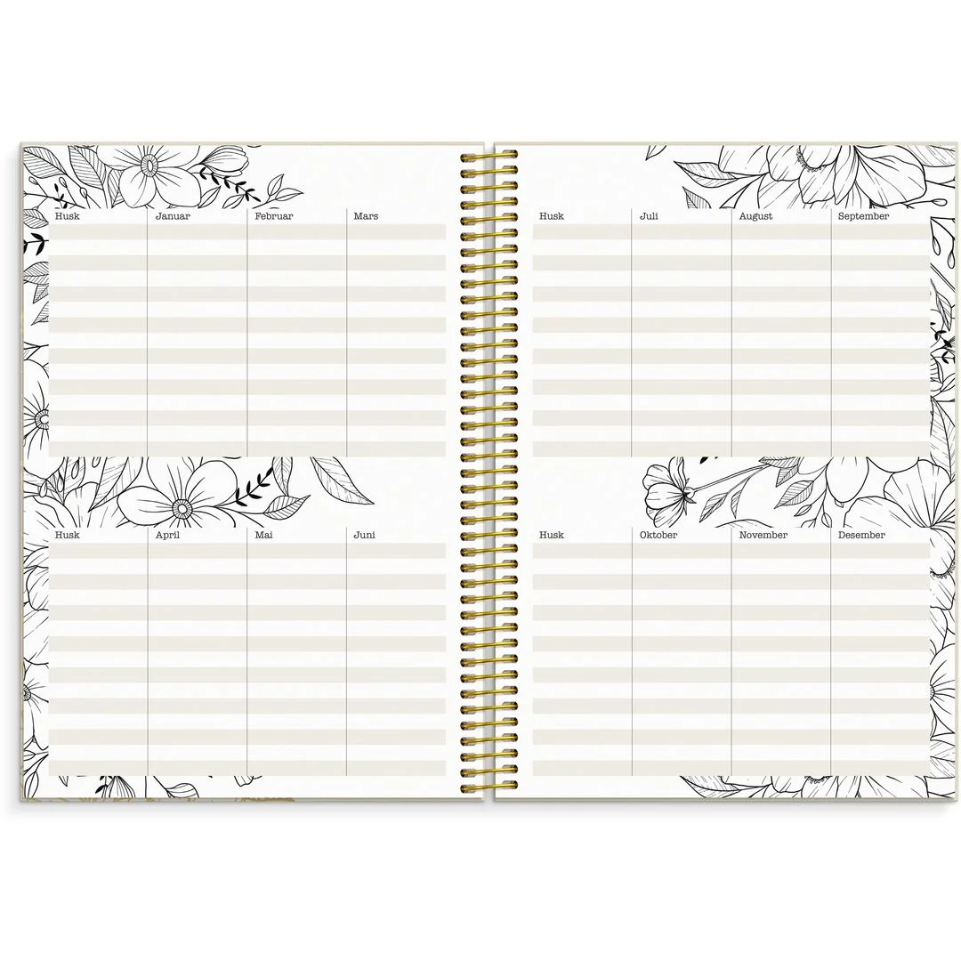 Brukeren kan velge å beholde den dempede fargeskalaen eller fargelegge selv. Årsoversikt med notatfelt, årsplanlegging og ukentlig oppslag med romantiske blomsterillustrasjoner. Månedlig oppslag med plass til planlegging og notater. Ekstra sider med huskelister og notatsider. Kalenderen er miljømerket FSC®, som betyr at hele produktet er produsert med papir og annet trevirke fra et ansvarlig og bærekraftig skogsbruk. Den har gullfarget spiral og gullfarget preget årstall. Den inneholder månedsoversikt og årsoversikt.