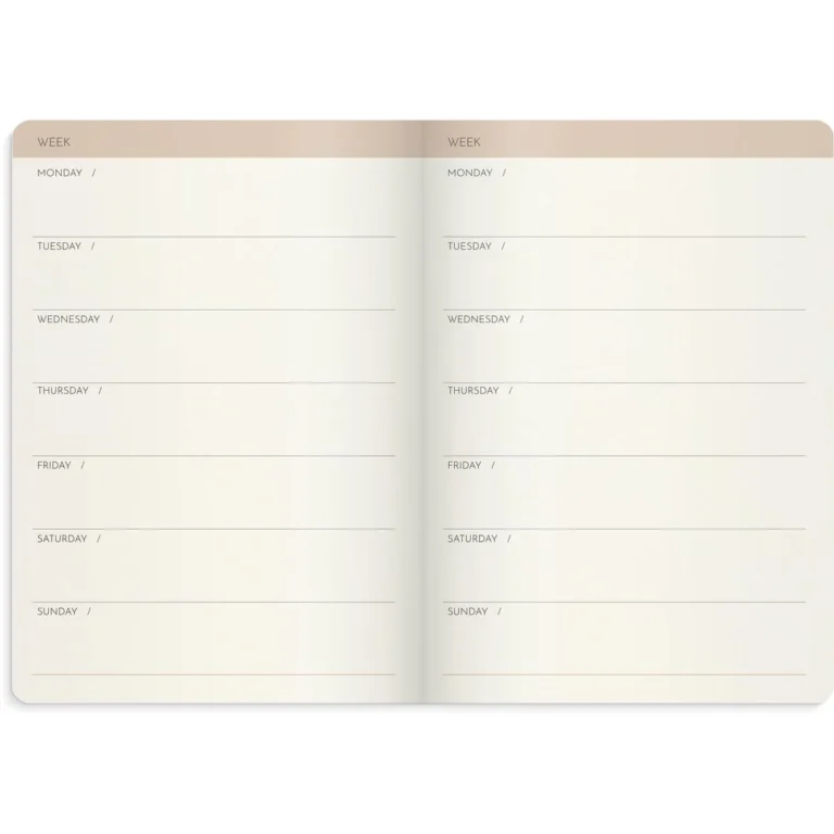 Samle dine ideer, drømmer og notater i en eksklusiv notatbok! Innbundet udatert kalender er en ukeplanlegger hvor du selv fyller inn datoer og ukenummer. På denne måten kan du enkelt bestemme når året ditt skal starte. Notebook Deluxe har et mykt omslag i imitert skinn. Denne notatboken med innbundet omslag ligger flatt når den er brettet. Innleveringen består av 160 kremfargede linjerte sider som venter på å bli fylt med notatene dine. Boken lukkes med en praktisk strikk og bak er det en lomme for kvitteringer og små sedler.