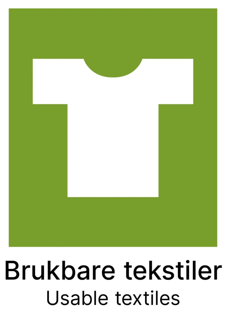 Kildesorteringsetikett i format 148x210mm med norsk og engelsk tekst. Etikett i PVC materiale med screentrykk og permanent lim. Kan brukes på innendørs og utendørs avfallsbeholdere. Etikett i PVC materiale med screentrykk og permanent lim. Kan brukes på innendørs og utendørs avfallsbeholdere. – Etikkett for kildesordering brukbar tekstil – Format: A5 – Materiale: PVC