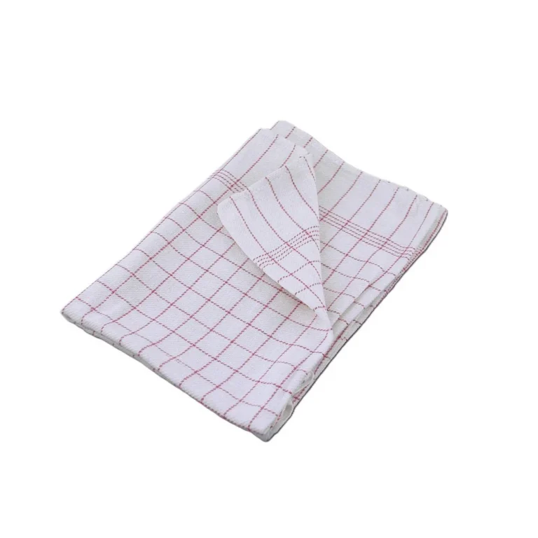 Kjøkkenhåndkle i bomull med røde striper. – Mål: 50×70 cm – Leveres i bunt a 25stk – Basic kjøkkenhåndkle i 100% bomull – Vekt: 210 g/m2 – Sydd på alle fire sider, med stropper i hver ende