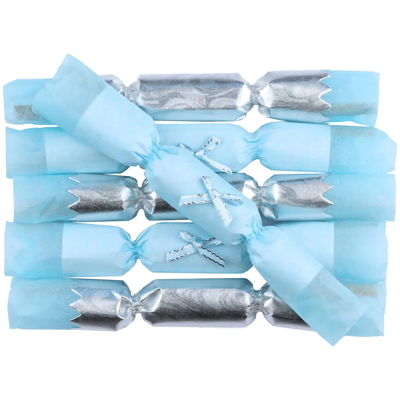 Gjør festen eller kaken ekstra morsom med disse klassiske knallbon-bonene. Hver bon-bon smeller når den trekkes fra hverandre, og inni finner du både vits og hatt. – Farge: Sølv og lys blå med blå sløyfedetaljer – Størrelse: 15,5 cm – Innhold: Vits og hatt – Perfekt til babyshower, dåp, bursdag eller festbordet – Et morsomt høydepunkt som passer til både voksne og barn, og som gir festen en ekstra stemning av glede og tradisjon.