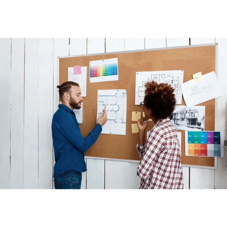 Spenstig naturlig korkoverflate som er selvhelbredende og viser aldri nålehull Bordhjørner med hull for enkel fiksering, forbedret stabilitet og mulighet for å monteres både stående og liggende. Aluminiumsramme inspirert av minimalistiske kontortrender.