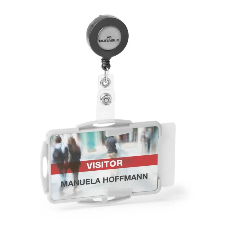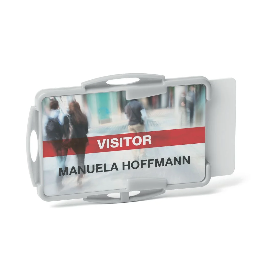 Praktisk kortholder for dobbelt kortbruk. DURABLE kortholderen er designet for enkel bruk av to adgangs- eller sikkerhetskort. Den har et åpent design som gjør det enkelt å sette inn og fjerne kort, og den kan brukes både stående og liggende. Laget av resirkulert plast og sertifisert med Blå Engel-miljømerket, tilbyr denne kortholderen en miljøvennlig løsning.