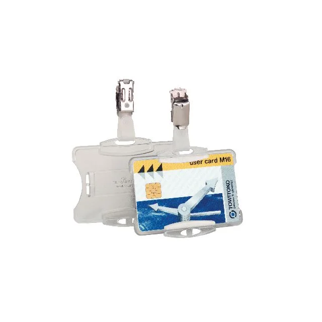 Selv om kortholderne leveres med en klype som kan festes til klær, kan de også brukes med en skiltlenke. Kortholderens fleksible design gjør at den kan brukes med både liggende og stående innlegg.