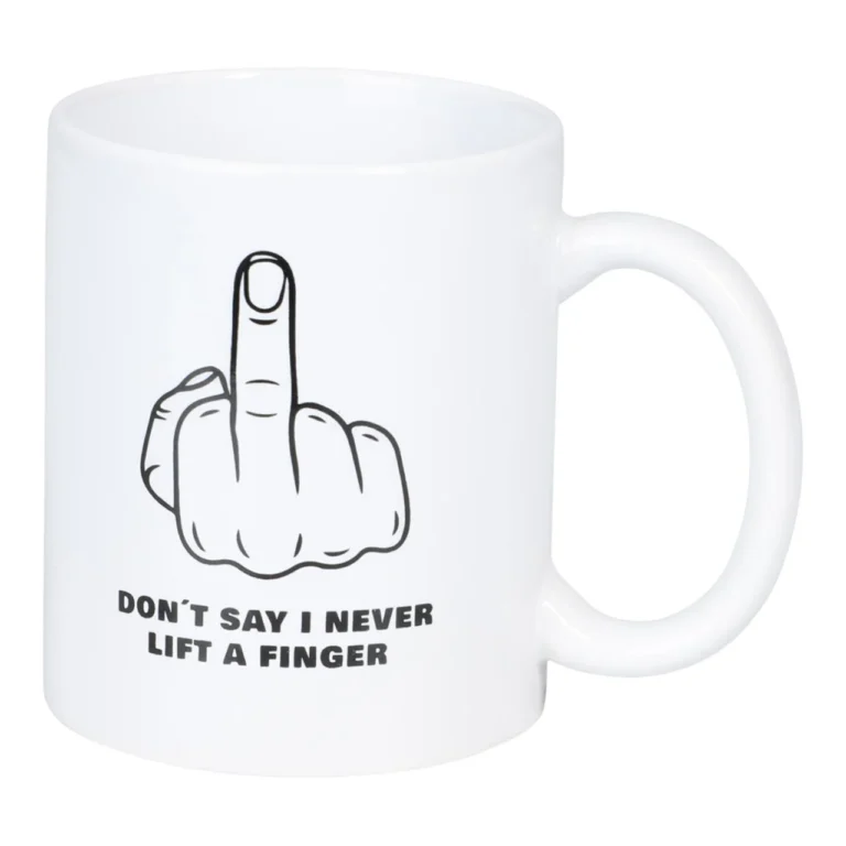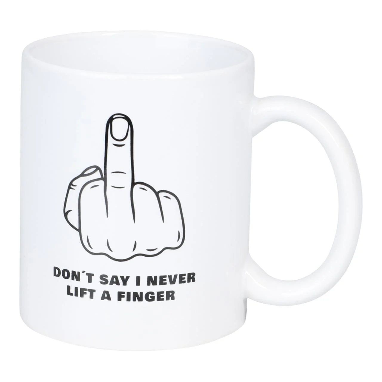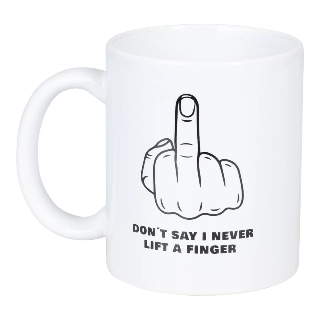 Krus med teksten «DONT SAY I NEVER LIFT A FINGER» – en skarp og humoristisk kommentar som er perfekt for deg med glimt i øyet. En morsom gave til en kollega eller venn som liker ironi.