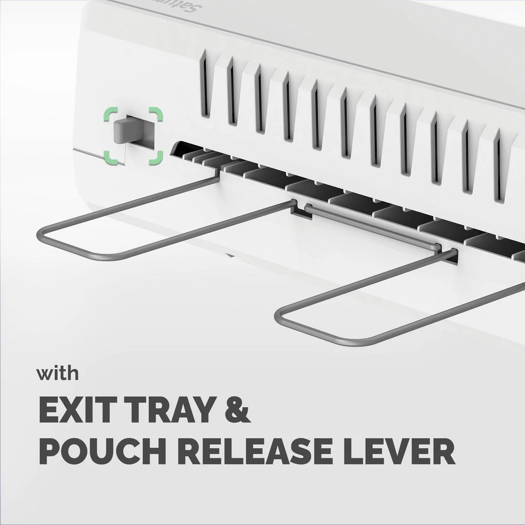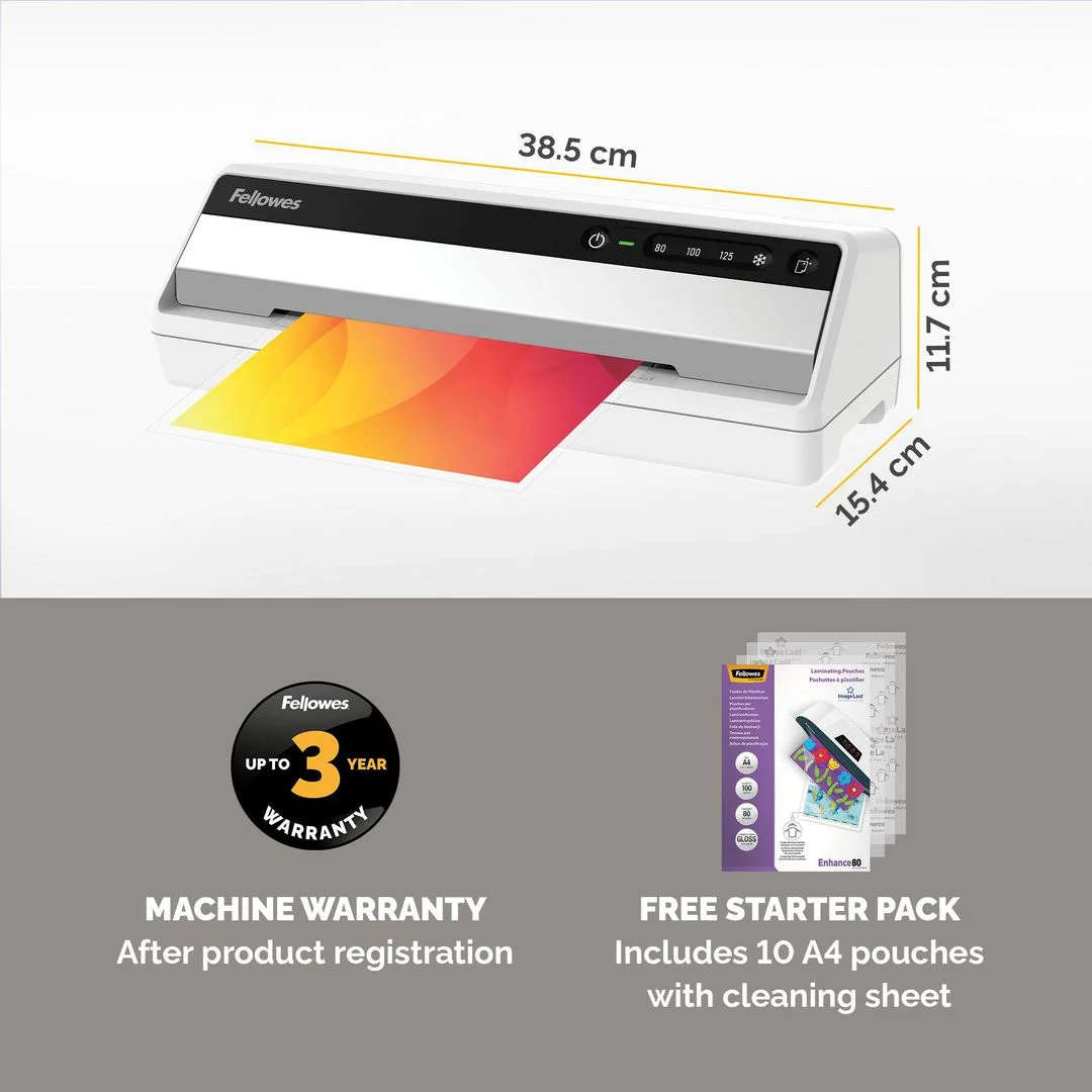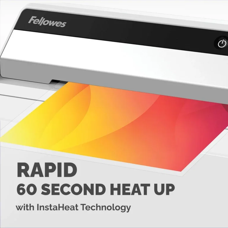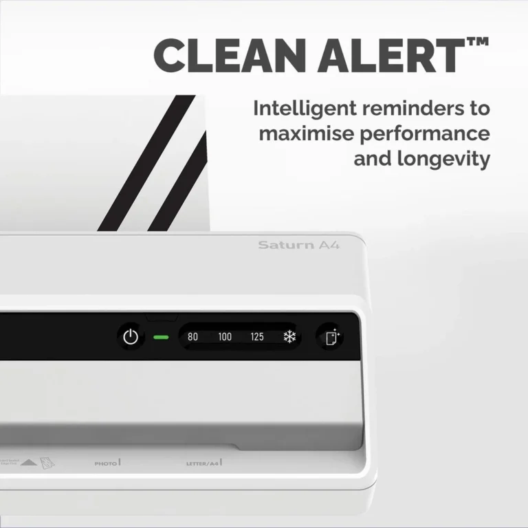 Presenter og beskytt dokumentene dine med stil med lamineringsmaskinen Saturn 3i A4 fra Fellowes® Lamineringsmaskinen Saturn 3i A4 er utstyrt med InstaHeat-teknologi, som reduserer oppvarmingstiden til bare 60 sekunder og gjør lamineringsoppgaven rask og effektiv. Saturn 3i A4 er ideell til bruk i klasserom eller på kontoret, og laminerer alle dokumenter opptil A4-størrelse. Den bruker lommer på 80–125 mikron, og vil oppdage et dokument som er matet feil inn i maskinen, noe som automatisk vil stoppe lamineringsprosessen slik at lommen kan mates inn på nytt.