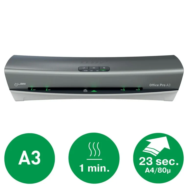 iLAM Laminator Office Pro A3 er brukervennlig og beskytter dokumentene dine mot smuss og skader. Den har LED-lys og et lydsignal som informerer deg om at maskinen er klar til å brukes. Lamineringsmaskinens stilige design passer perfekt på et moderne kontor. laminer alle dokumenter opptil A3 oppvarmingstid 60 sekunder bruker poser på 80–175 mikron slår seg av automatisk.