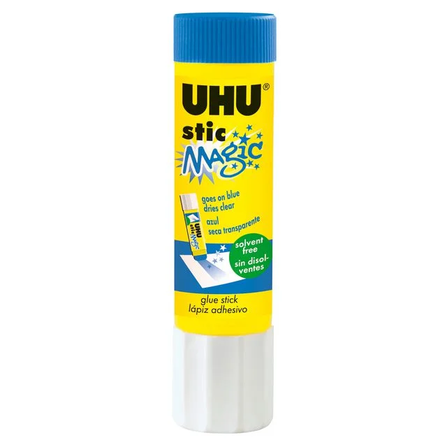 UHU® Magic-limstiften har en unik metode for påføring av lim. Den har en blå farge, som lar deg se akkurat hvor du påfører limet for bedre presisjon. Fargen forsvinner noen sekunder etter påføring, og blir helt klar når limet tørker. Denne magiske limstiften gir ren, rask og jevn påføring av lim for generelt bruk i hjemmet, på skolen og kontoret samt til kunst og håndverk. Limer papir, papp, bilder, Styrofoam® og mer. Skrukorken hindrer at limet tørker ut og gir lengre holdbarhet. Dette kraftige og holdbare limet er laget av 70 % naturlige ingredienser, er løsemiddelfritt og kan vaskes bort med kaldt vann. UHU® Magic-limstiften er derfor et naturlig valg for den miljøbevisste.