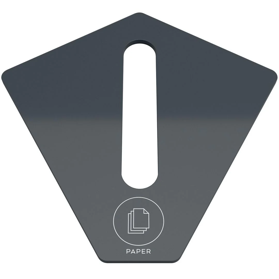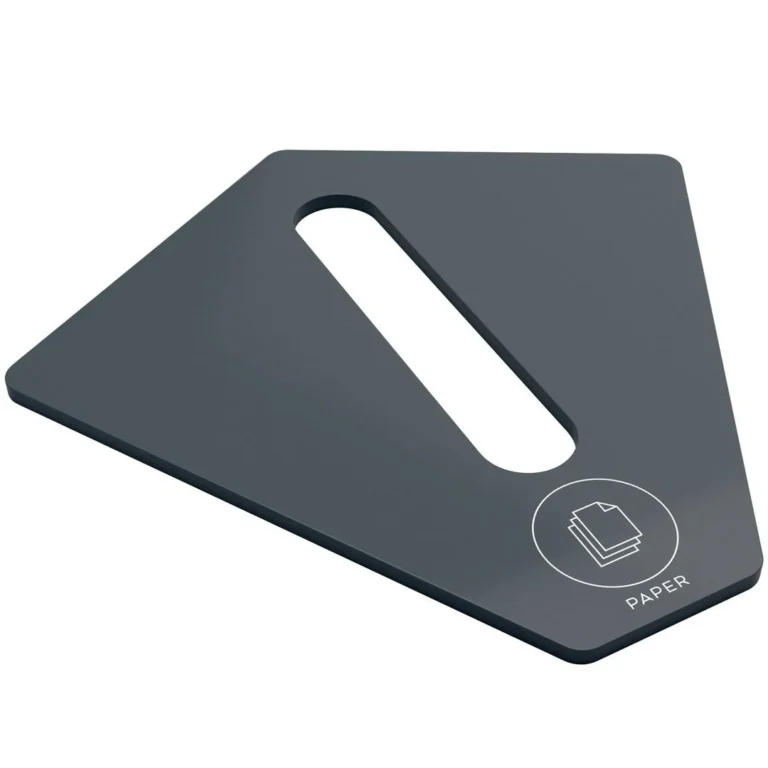 Lokk tilhørende Kite avfallsebeholder med symbol og tekst. Vakuumfoliert MDF i forskjellige farger og silketrykt symbol i grått. Lokkene finnes i flere varianter med matchende hullmønster. Merk at teksten på lokket er på engelsk. – Kildesortering: Papir. – Størrelse: 44 x 44 cm. – Farge: antrasitt.