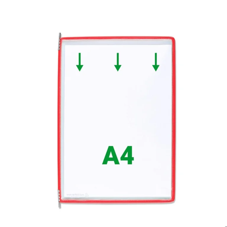 Den røde rammen gjør det enkelt å fargekode og raskt finne frem riktig dokument, mens den integrerte stålramsen gir maksimal slitestyrke. Perfekt til alt fra HMS-informasjon og instruksjoner til prislister og skjemaer – og kompatibel med alle Tarifold vegg- og bordstativ for effektiv visning.