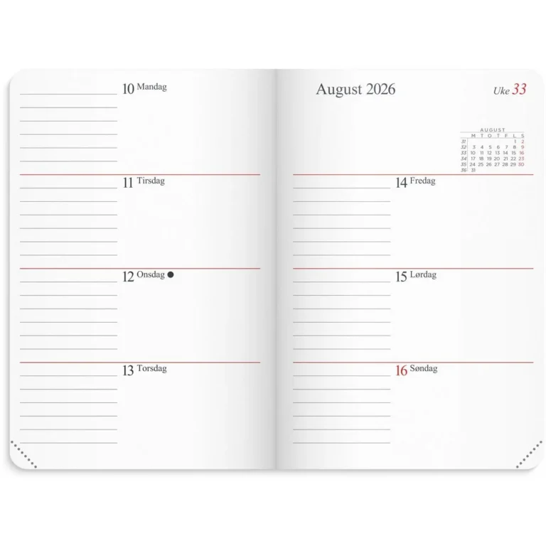 En populær lommekalender innbundet i imitert skinn, med strikk og lesebånd. Kalenderen er en del av en større serie med Gemini kalendere. Felles for Gemini er at selv om den er liten nok til å få plass i lommen oppleves den som romslig med god plass til å notere inni. Kalenderen viser hele uken over to sider (ukeoppslag). Lesebåndet gjør det enkelt for deg å holde oversikt over hvilken uke som er aktuell, og strikken holder kalenderen fint igjen. Løse ark og kvitteringer kan du putte i papirlommen bak i kalenderen. Den inneholder kalendariske opplysninger, telefonguide, månedsoversikt, årsoversikt, månefaser, helligdager og kongelige fødselsdager. – Følger kalenderåret – Får plass både i lommen og i vesken – Omslag i mykt imitert skinn – Innbundet – Lesebånd – Strikk – Papirlomme bak – Liggende uke/oppslag – Månedsplaner og årsoversikt for inneværende og kommende år – Månefaser, helligdager og kongelige fødselsdager – Linjerte notatsider – Hjørneperforering – 136 sider – 70g papir – Format: 82x123mm