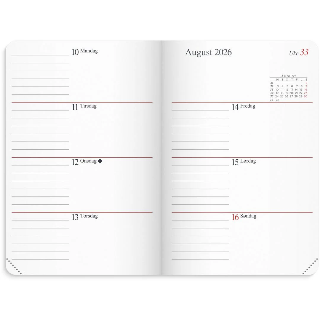 En populær lommekalender innbundet i imitert skinn, med strikk og lesebånd.