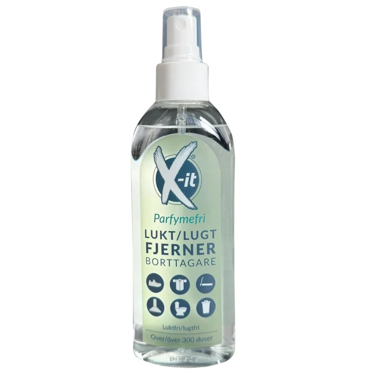 Luktfjerner som fjernet vond lukt uten å lukte. Inneholder verken parfyme eller parabener. Både astmatikere og personer med ulike allergier kan uten problem benytte seg av X-it. Fjerner lukten istedenfor å maskere med parfymelukt, som vanlige luktfjernere gjør. Bruk X-it for å effektivt fjerne lukt fra matos, toaletter, sure sko, oppkast, røyk, kroppslukt , flekker på tekstiler, bleier, parfyme m. m.