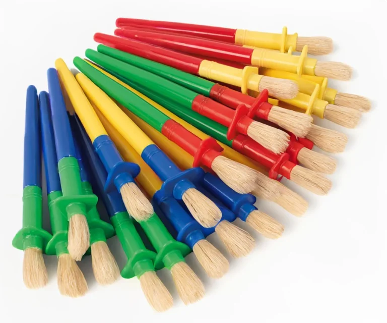 Kortere pensler av svinebust med grepvennlige skaft for de minste barna. Sprutbeskyttelse i fine farger. – Pakke med 24 stk – Bredde: 10mm
