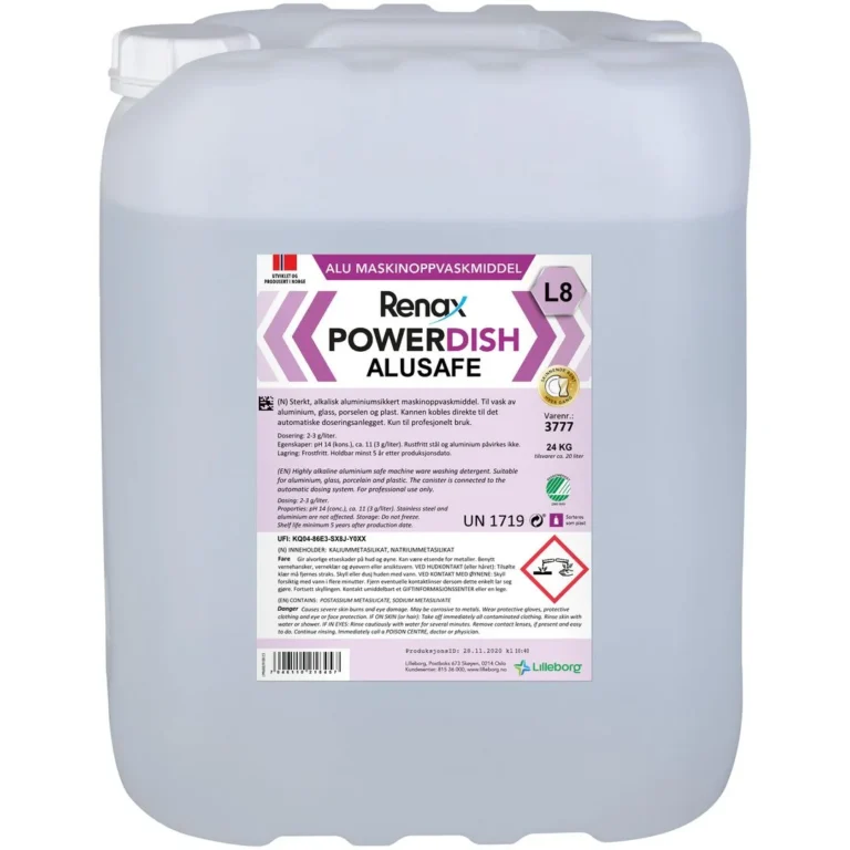 Renax PowerDish AluSafe L8 er et sterkt alkalisk, ikke-korroderende oppvaskmiddel som benyttes til vask av glass, porselen, plast og bestikk. vannkvaliteter.
