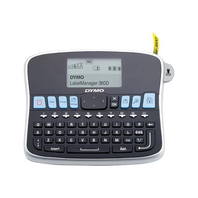 - LabelManager™-etikettmaskinen gjør organiseringen enklere og gir resultater av høy kvalitet. DYMO® LabelManager™ 360D-etikettmaskinen er en frittstående skrivebordsenhet. Maskinen tilbyr stor allsidighet med 3 skrifttyper, 7 skriftstiler og 8 forskjellige bokser. Den grafiske skjermen på 40 x 70 mm på LabelManager™ 360D gir et klart bilde av hvordan etiketten vil bli når den skrives ut.