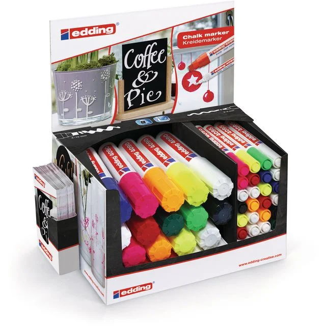 Edding 4090 Chalk Marker har en bred skråskåret spiss med en strekbredde på 4–15 mm og passer perfekt til oppgaver som krever fete og markerte linjer. Godt egnet på glass, vinduer, sorte tavler og speil Bred skråskåret spiss til fet og markert skrift.